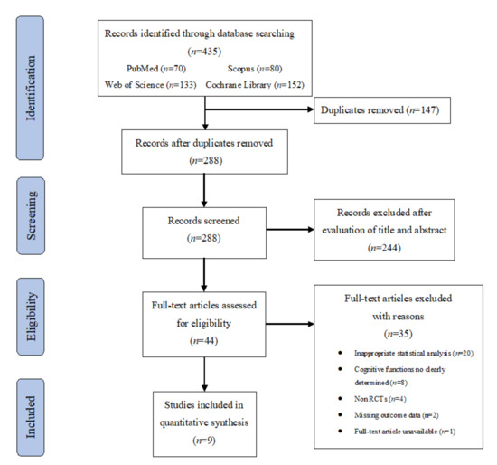 The flow of records through the review is summarized in Figure 1. The combined search from four databases resulted in 435 potentially appropriate publications. After removing duplicates, 288 records were screened by title and abstract, which resulted in the exclusion of 244 records. The full texts of the remaining 44 articles were examined for eligibility assessment, after which 35 studies were excluded for the following reasons: inappropriate statistical analysis (n = 20); cognitive functions not clearly determined (n = 8); non RCTs (n = 4); missing outcome data (n = 2); full-text article unavailable (n = 1). Thus, a total of 9 studies [34,35,36,37,38,39,40,41,42] were included in the final analyses.