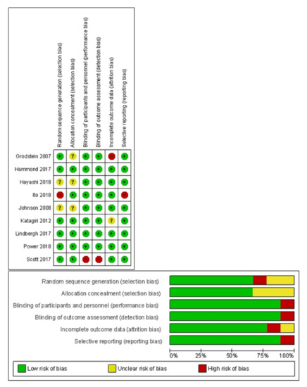 - Higgins, J.P.T.; Altman, D.G.; Gøtzsche, P.C.; Jüni, P.; Moher, D.; Oxman, A.D.; Savović, J.; Schulz, K.F.; Weeks, L.; Sterne, J.A.C.; et al. The Cochrane Collaboration’s tool for assessing risk of bias in randomised trials. BMJ 2011, 343, d5928. [Google Scholar] [CrossRef] [PubMed]