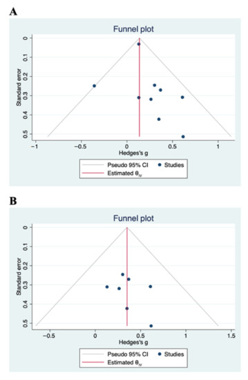 Figure 3A displays a forest plot with the summary effect of carotenoid intervention on cognitive functions. Overall, we meta-analyzed 9 RCTs involving 2228 and 2174 subjects in the treated and control groups, respectively. Meta-analysis showed a statistically significant improvement of cognitive functions after administration of carotenoids (Hedge’s g = 0.14; 95% CI: 0.08, 0.20, p < 0.0001). Although there was no evidence of significant heterogeneity among studies (τ2 = 0.00, I2 = 0.00%, H2 = 1.00), we carried out a sensitivity analysis by omitting two studies from the pooled analysis. We removed the study by Grodstein et al. [34] because its relative contribution to the pooled meta-analysis result (weight = 92.13%) obscured the contribution of each study to the overall result. We also excluded the study by Katagiri et al. [39], mainly because of a higher degree of heterogeneity among studies. Using a fixed-effects model, the sensitivity analysis did not change the overall findings obtained from the primary analysis. The positive effects of carotenoids on cognitive functions remained significant (Hedge’s g = 0.35; 95% CI: 0.12, 0.58, p < 0.0001) (Figure 3B). The total number of subjects in the sensitivity analysis was 290. The absence of statistical heterogeneity has also been confirmed (τ2 = 0.00, I2 = 0.00%, H2 = 1.00). We present the funnel plots for the primary and sensitivity analyses in Figure 4. Visual inspection of the funnel plots and Egger’s test (p = 0.789) indicate no evidence of asymmetry, and, therefore, no strong evidence of publication bias.