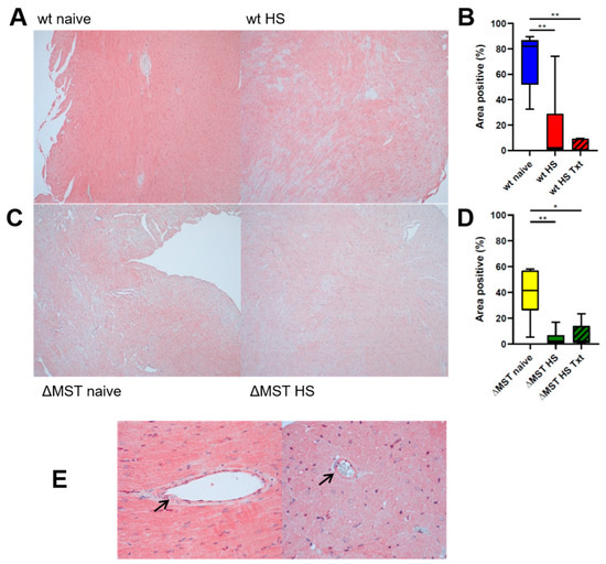 Interestingly, MST was detected in the heart and coronary vasculature (see Figure 1C) of both wt and ΔMST naive mice. However, ΔMST mice presented with lower MST expression than the wt littermates. While both HS alone and the combination of HS and Txt further reduced cardiac MST, this difference between wt and ΔMST was abolished by the challenge of HS with(out) Txt.