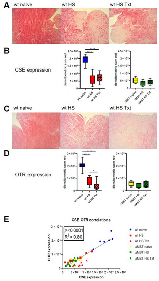CSE and OTR were constitutively expressed in cardiomyocytes of naive animals (see Figure 2A,C, left panel). In wt animals, HS and HS + Txt significantly reduced expression of cardiac CSE and OTR compared to naïve animals. ΔMST animals had significantly lower CSE and OTR expression already in the naive state, and no further reduction in MST expression after injury was observed (see Figure 2A–D). The ΔMST groups all had reduced CSE and OTR expression compared to naive wt. There was no difference in CSE and OTR expression between ΔMST and wt after trauma (see Figure 2A–D). There was a direct, linear relationship between CSE and OTR expression in all animals, independent of the genetic background or injury (see Figure 2E).