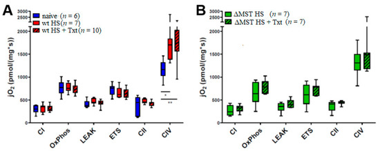 Mitochondrial respiratory capacity in the heart. (A) Wt animals. (B) ΔMST animals. jO2: oxygen flux, CI: mitochondrial oxygen consumption after addition of substrates for the stimulation of complex I, OxPhos: maximum respiratory capacity in the coupled state, LEAK: mitochondrial oxygen consumption after inhibition of ATP synthase in the coupled state, ETS: maximum respiratory capacity in the uncoupled state, CII: mitochondrial oxygen consumption depending on the activity of complex II after inhibition of complex I, CIV: oxygen consumption after stimulation of complex IV. Boxplots depict the median and interquartile range, and whiskers represent the minimum and maximum values. ** p < 0.01, * p < 0.05.