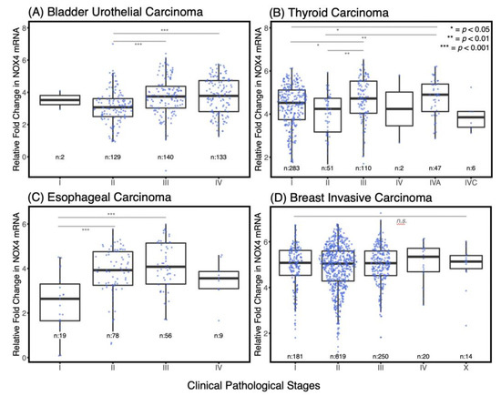 NOX4 mRNA levels are increased in the advanced stages of several cancer types. Samples were grouped by studies and subdivided into clinical stages. Boxplots representing the relative fold change in NOX4 mRNA (natural log of NOX4 RNA-seq by expectation-maximization (RSEM) values) were generated and Kruskal–Wallis rank sum tests along with post hoc Dunn tests for multiple comparisons were used to determine the significance in variance and the adjusted p-values. In bladder, thyroid and esophageal carcinoma, NOX4 mRNA levels generally increase as the cancers progress ((A–C), respectively), although NOX4 remained unchanged in breast carcinoma (D). The number of samples is indicated below each bar.