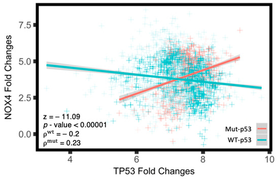 In the Preliminary Pan-Cancer Dataset, we sorted tumor samples as having WT-TP53 or any of the 15 most common hot-spot mutants (Mut-p53) and found that in tumors with Mut-TP53, the level of p53 mRNA positively correlates with NOX4 mRNA (ρ = 0.23), whereas WT-TP53 mRNA negatively correlates with NOX4 mRNA (ρ = −0.2, Figure 3). This corroborates our earlier findings, where WT-p53 suppresses whereas Mut-p53 enhances NOX4 expression in established epithelial tumor cell culture models [16,17]. This also suggests that TP53 mutation status may play a critical role in cellular processes previously shown to involve NOX4, such as EMT, cell migration, angiogenesis and other genetic and metabolic programs that promote cancer progression [15,16,20,37,38].