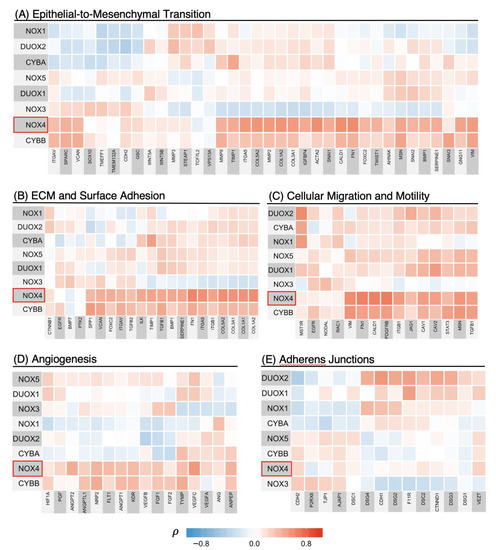 NOX4 positively correlates with several genetic programs of cancer progression in the Pan-Cancer cohort. Spearman’s rank correlation coefficients, ρ, were calculated and mapped to assess the relationships between individual NADPH oxidases and various genetic programs of cancer progression, such as epithelial-to-mesenchymal transition (EMT), extracellular matrix (ECM)/surface adhesion, cell migration and motility and angiogenesis ((A–D), respectively) using the Final Pan-Cancer Dataset. NOX4 expression shows strong positive correlations with genes in programs (A–D), but poor correlations with epithelial marker genes in (E). The direction of correlation is indicated by the color: blue is a negative whereas red is a positive correlation, and the strength of the correlation is represented by the color intensity. Genes listed with each program and their corresponding functions in cancer are provided in Table S1.