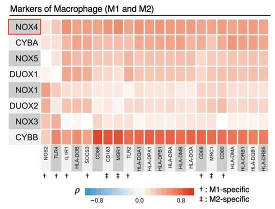 The source of CYBB (NOX2) is likely due to tumor-associated macrophages (TAMs). Spearman’s rank correlation coefficients, ρ, were calculated in the Final Pan-Cancer Dataset to assess for monotonic relationships between the individual NADPH oxidases and canonical markers of M1 and M2 macrophages. CYBB (NOX2) expression strongly correlates with most markers of M1 and M2 classification of macrophages. A key to gene abbreviations listed is provided in Table S2.