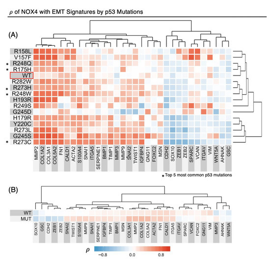 Common TP53 mutations strengthen the correlation coefficients of NOX4 mRNA with EMT genes. (A) Samples in the Final Pan-Cancer Dataset were identified as harboring WT-TP53 or any of the indicated common Mut-TP53, and the Spearman’s rank correlation coefficients ρ were calculated for NOX4 with the EMT genes indicated on the x-axis. (B) All p53 mutations studied were collapsed into one group, indicated by mutant (MUT), versus wild-type (WT), and the resulting ρ of NOX4-EMT genes were mapped. Unsupervised clustering was performed for both (A) and (B).