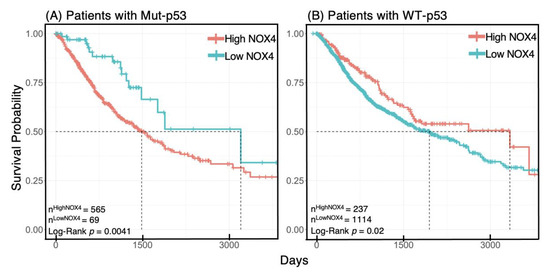 Increased NOX4 mRNA is deleterious to survival in the presence of mut-p53. Patients in the Final Pan-Cancer Dataset were identified as harboring a mutated form of TP53 (A) or WT-TP53 (B). Optimized cut-off points were then calculated for high vs. low NOX4 mRNA levels for each group and Kaplan–Meier plots and Log-rank tests were used to estimate survival probability and p-values, respectively. Ten-year survival (3650 days) is shown in both (A) and (B).