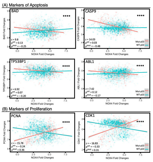 To explore how NOX4 is influenced by WT-p53 or Mut-p53 to produce favorable or deleterious survival outcomes, respectively, we evaluated whether NOX4 is associated with other clinically relevant cellular processes such as cell proliferation and apoptosis. Previously, NOX4 has been implicated in these cellular processes in several cancer models but not in a Pan-Cancer cohort in relation to p53 [14,21,22,23]. We employed linear regression to assess for broad relationships, followed by Spearman’s rank test and comparison of ρ-values using the Fisher r-to-z transformation. In tumor samples with Mut-TP53, NOX4 overexpression is positively correlated with proliferation markers such as proliferating cell nuclear antigen (PCNA) and cyclin-dependent kinase 1 (CDK1, Figure 8A), and negatively correlated with apoptosis-related markers such as Bcl-associated agonist of cell death (BAD), caspase 9 (CASP9), tyrosine-protein kinase ABL1 (ABL1), and TP53-binding protein 1 (TP53BP1) (Figure 8B). In contrast, the opposite trends were observed in tumor samples with WT-TP53: NOX4 is negatively correlated with the proliferation marker PCNA and CDK1 in tumors with WT-TP53.