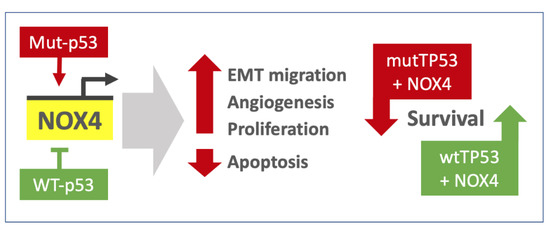 Schematic summary. Divergent effects of mutant versus WT p53 on NOX4 expression and downstream consequences on cancer progression programs (left). Contrasting effects of high NOX4 expression on survival outcomes in patients with WT versus mutant TP53 tumors (right).