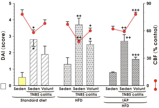Effect of voluntary exercise with or without treatment with intestinal alkaline phosphatase (IAP) on the disease activity index (DAI) and the accompanying alterations in colonic blood flow (CBF), presented as red lines in this figure, in sedentary (Seden) mice with 2,4,6-trinitrobenzenesulfonic acid (TNBS)-induced colitis fed standard diet (SD) or high-fat diet (HFD). Results are mean ± S.E.M. of eight animals per group, * significantly different (p < 0.05) from sedentary mice fed SD, *+ significantly different (p < 0.05) from sedentary mice fed HFD, + significantly different (p < 0.05) from animals fed SD not subjected to voluntary exercise, ++ significantly different from sedentary mice fed HFD with colitis (p < 0.05) without IAP administration, +++ significantly different (p < 0.05) from sedentary mice fed HFD with or without IAP administration.