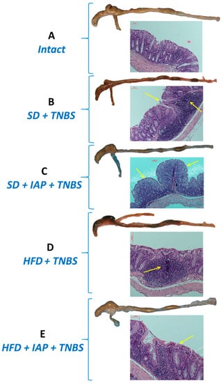 The representative gross (upper panel) and microscopic (lower panel) appearance of colon from intact mouse (A), sedentary mouse with TNBS colitis fed standard diet (SD) (B), sedentary mouse fed SD with colitis treated with IAP with voluntary exercise on wheels (C), sedentary mouse fed HFD with colitis (D) and mouse fed HFD with colitis treated with IAP with voluntary exercise on wheels (E). In mice fed SD or HFD with colitis, the enterocyte architecture is distorted, revealing edema and infiltration of mucosa and submucosa with inflammatory cells, destroyed crypts, extended ulcerations and transmural inflammatory cell infiltrates (B,D) (arrows) as compared with exercising mice fed either with SD or HFD treated with IAP (C,E). Treatment with IAP, especially in HFD exercising mice, led to partial restoration of colonic mucosal lining (arrows), partial preservation of enterocyte structure, low levels of epithelial damage and less severe inflammatory cell infiltration of the colonic mucosa and submucosal structure.