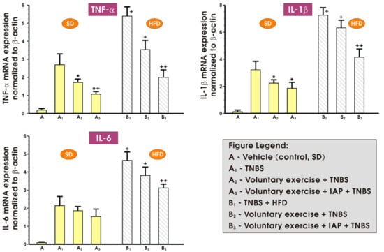 The effect of treatment with IAP combined with voluntary exercise on the mRNA expression of proinflammatory cytokines TNFα, IL-1β and IL-6 in the colonic mucosa of sedentary or exercising mice fed an SD or a HFD. Results are mean ± S.E.M. of four animals per experimental group, * significantly different (p < 0.05) from the sedentary colitis mice fed SD, *+ significantly different from (p < 0.05) the sedentary animals with colitis fed SD, + significantly different (p < 0.05) from the sedentary colitis mice fed HFD without exercise, ++ significantly different (p < 0.05) from the sedentary HFD animals with colitis subjected to voluntary exercise.