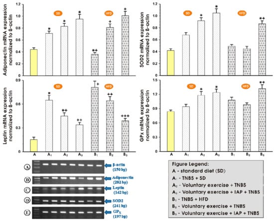 Assessment of gene expression in colonic mucosa and mesenteric adipose tissue samples was performed by quantitative real-time polymerase chain reaction (qRT-PCR). The total RNA from both colonic mucosa and adipose tissue was extracted using an RNeasy Plus Mini Kit (Qiagen, Hilden, Germany). The NanoDrop 2000 spectrophotometer (Thermo Scientific, Wilmington, DE, USA) was used to evaluate the concentration and quality of RNA. RNA was reverse-transcribed using a High-Capacity RNA-to-cDNA Kit (Applied Biosystems, Foster City, CA, USA). Real-time polymerase chain reaction (PCR) was performed using a StepOne Plus system (Applied Biosystems, Foster City, CA, USA) and applying a TaqMan Gene Expression Master Mix (Applied Biosystems) and TaqMan Gene Expression Assays (Applied Biosystems) for TNF-α, IL-6, adiponectin, leptin, SOD2 and GPx. The β-actin was used as a housekeeping gene. The sequences of the primers are available following request. The relative gene expression was calculated according to a 2−ΔΔCt method. In some tests, RT-PCR was also performed for better visualization in the unchanged colon mucosa of intact rats or those with TNBS colitis fed with different diets SD and HFD with or without IAP administration to assess the alteration in the colonic mRNA expression of adiponectin, leptin, SOD2 and GPx mRNA. For RT-PCR assessment, the colonic mucosal samples weighing approximately 200 mg were scraped using a glass slide. Thereafter, mucosal scrapings were immediately quick-frozen in liquid nitrogen and stored at −80 °C until RT-PCR analysis. The method of Chomczynski and Sacchi was used to isolate total RNA from mucosal samples []. The concentration and quality of the extracted RNA was measured on a spectrophotometer. Then, 5 µg of total mRNA was reverse transcribed into cDNA using StrataScript reverse transcriptase and oligo (dT) primers (Stratagene) in a DNA thermocycler (Perkin-Elmer-Cetus, Norwalk, CT, USA). RT-PCR analysis included the following primer nucleotide sequences: