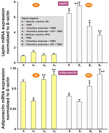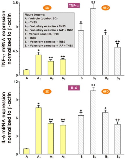 Figure 5 shows the effect of treatment with IAP combined with voluntary exercise on the changes in mRNA expression of TNF-α and IL-6 in mesenteric white adipose tissue of the mice fed HFD or SD. In the sedentary mice fed SD or HFD, the intrarectal application of TNBS caused a substantial increase in mRNA expression of TNF-α and IL-6 in mesenteric fat (p < 0.05) (Figure 5, upper and lower panels, respectively). Voluntary physical activity significantly decreased the expression of these proinflammatory biomarkers in adipose tissue of mice fed SD and HFD as compared to respective values achieved in sedentary animals fed SD and HFD (Figure 5). A further increase in the expression of TNF-α and IL-6 was observed in mice fed a HFD with TNBS-induced colitis; however, when the SD and HFD mice were subjected to voluntary training, a significant decrease in the expression of TNF-α and IL-6 was observed when compared to respective values obtained in comparison with the sedentary TNBS group fed SD and HFD (p < 0.05) (Figure 5, upper and lower panels, respectively). The treatment with IAP combined with voluntary exercise potentiated this anti-inflammatory action, as manifested by a further significant decrease in the expression of TNF-α and IL-6 compared with animals subjected to moderate physical activity without IAP administration (Figure 5, upper and lower panels, respectively).