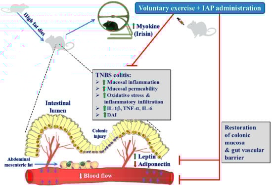 The summary scheme of the beneficial effect exhibited by the combination of IAP treatment with moderate physical activity in the mechanism of the healing of experimental colitis in mice fed HFD. The mucosal damage and an impairment in the colonic microcirculation and downregulation of antioxidative biomarkers induced by TNBS accompanied by mucosal inflammation and oxidative stress are restored by the combination of IAP and voluntary exercise due to better restoration of colonic mucosa and an improvement of gut vascular barrier caused by antioxidative myokines and adipokines.