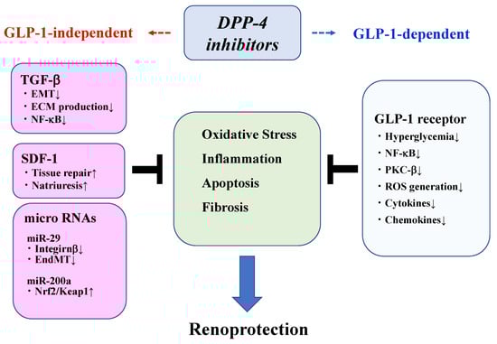 DPP-4 inhibitors have been shown to inhibit DKD in GLP-1R-deficient mice. Hasan et al. showed that linagliptin attenuated renal interstitial fibrosis by inhibiting TGF-β/Smad3-mediated fibrotic response in GLP-1R-deficient mice with 5/6 nephrectomy []. As mentioned above, Takashima et al. demonstrated that alogliptin ameliorates DKD by upregulating SDF-1α in GLP-1R-deficient diabetic-prone KK/Ta-Akita mice []. These findings indicated that DPP-4 inhibitors can attenuate DKD via a GLP-1-independent pathway.