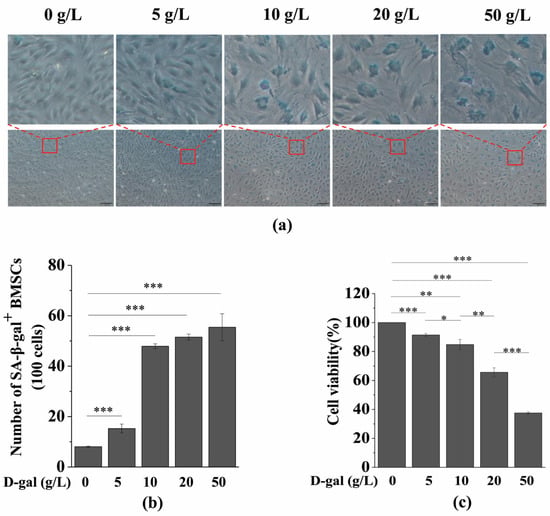 The concentration of D-gal that induces cell senescence may vary depending on the cell type, so we constructed a model of D-gal-induced BMSC senescence. In this experiment, SA-β-gal staining and a cell viability assay were performed to determine the optimal concentration of D-gal to induce BMSC senescence. As shown in Figure 1a,b, only a few BMSCs in the control group were SA-β-gal+ cells. However, the number of SA-β-gal+ cells significantly increased with an increasing D-gal concentration. Meanwhile, the cell viability also decreased significantly with an increasing D-gal concentration (Figure 1c). Considering these results, the experimental group with a relatively high number of SA-β-gal+ cells and a relatively small decrease in cell viability meets the requirements. Therefore, 10 g/L of D-gal was used to construct the aging model for BMSCs.