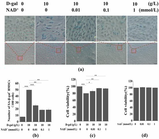 To investigate the effect of exogenous NAD+ on senescent BMSCs, the cells were treated with different concentrations of NAD+ (0.01, 0.1, and 1 mmol/L), and then SA-β-gal staining and a CCK-8 assay were used to detect SA-β-gal activity and cell viability, respectively. The results showed that the number of SA-β-gal+ cells decreased significantly with an increasing NAD+ concentration when compared the results for the D-gal-induced group (Figure 2a,b). Moreover, the cell viability increased significantly with an increasing NAD+ concentration (Figure 2c). In addition, the CCK-8 assay showed that different concentrations of NAD+ had no obvious toxic effects or side effects on normal BMSCs (Figure 2c). These results suggest that exogenous NAD+ increases the cell viability of senescent BMSCs and protects them from D-gal-induced senescence.