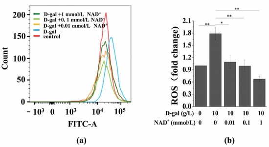 Oxidative stress is an important cause of cell senescence. High concentrations of ROS cause oxidative damage to various organelles and induce cell senescence or death [,,,]. It is known that D-gal generates a large amount of ROS under the action of galactosidase, which causes cell dysfunction and promotes cell senescence. Therefore, we tested the effect of exogenous NAD+ on intracellular ROS in senescent BMSCs. The results showed that D-gal significantly upregulated intracellular ROS, while exogenous NAD+ reversed this phenomenon (Figure 4).