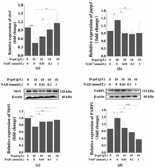 Studies have shown that Sirtuins and PARPs are two major enzymes in mammals that respond to NAD+ signals. As reported before, Sirt1 senses changes in intracellular NAD+ and transmits corresponding signals through NAD+-dependent protein deacetylation []. We have found that intracellular NAD+ significantly increased with exogenous NAD+ in senescent BMSCs. To determine whether Sirt1 was involved in the protection of senescent BMSCs by exogenous NAD+, we first examined the expression of the Sirt1 protein in senescent BMSCs with or without exogenous NAD+. It can be seen from the results that the expression of Sirt1 in D-gal-induced BMSCs were significantly downregulated; however, exogenous NAD+ restored the expression of Sirt1 at both mRNA (Figure 5a) and protein (Figure 5c) levels in senescent BMSCs. It is well known that P53 is a downstream target of the Sirt1 anti-aging pathway, and studies have shown that mouse P53 KO delayed the senescence of ovaries. We found that exogenous NAD+ downregulates D-gal-induced p53 (Figure S1a) and its protein (Figure S1b) expression.