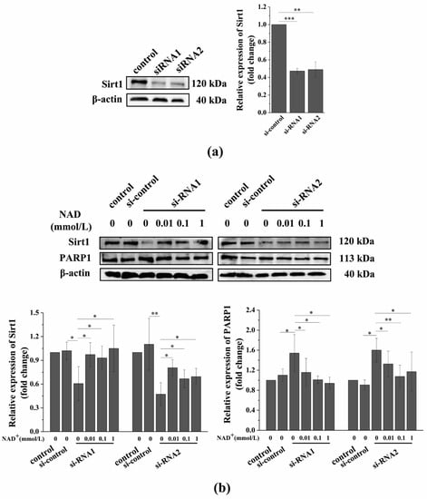 Our previous results that suggest that exogenous NAD+ postpones the D-gal-induced senescence of BMSCs may be related to the expression of Sirt1 and PARP1. However, Sirt1 and PARP1 not only compete with each other for intracellular NAD+, but also have dense crosstalk through cross-modification and transcriptional regulation. As a result, Sirt1 and PARP1 might be able to cancel each other’s regulation of cell survival []. Our aforementioned experimental results show that exogenous NAD+ significantly upregulated the expression of Sirt1 and inhibited the expression of PARP1 in senescent BMSCs. Thus, we further investigated the role of Sirt1 in postponing D-gal-induced BMSC senescence with exogenous NAD+ by the knockdown of Sirt1 with si-RNA. These findings revealed that Sirt1 expression was significantly downregulated after the knockdown of Sirt1 (Figure 6a,b). In contrast, the expressions of PARP1 (Figure 6b), P53 (Figure S2a), and CD38 (Figure S2b) in senescent BMSCs were significantly upregulated. Fortunately, exogenous NAD+ reversed the expression changes of these molecules in senescent BMSCs featuring Sirt1 knockdown, although the expressions of these proteins were not completely restored when compared to normal BMSCs (Figure 6). However, the changes of these protein expressions and the concentration of exogenous NAD+ did not show a specific pattern in this study.
