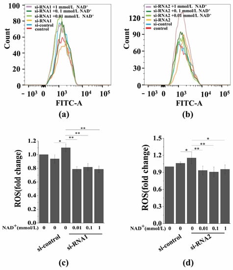 Sirt1 knockdown represses exogenous NAD+-inhibited intracellular ROS generation. (a,b) After the knockdown of Sirt1 by two different si-RNA sequences for 48 h, D-gal-induced senescent BMSCs were treated with different concentrations of NAD+ for another 48 h. The detection of intracellular ROS was carried out by flow cytometry. (c,d) Quantitative analysis of intracellular ROS. The data are expressed as means ± standard deviation; n = 3; * p < 0.05; ** p < 0.01. BMSCs: Bone marrow-derived mesenchymal stem cells; D-gal: D-galactose; NAD+: Nicotinamide adenine dinucleotide; ROS: Reactive oxygen species.
