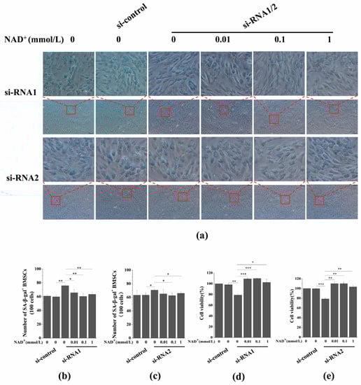 To further evaluate the role of Sirt1 in mediating NAD+-affected BMSC senescence induced by D-gal, we determined the effect of exogenous NAD+ on intracellular ROS generation after Sirt1 knockdown in senescent BMSCs. Our results showed that intracellular ROS generation significantly increased by knockdown Sirt1, and, importantly, Sirt1 knockdown by si-RNA1 (Figure 7a,c) or si-RNA2 (Figure 7b,d) reduced the inhibitory effect of exogenous NAD+ on ROS generation in senescent BMSCs. In addition, SA-β-gal staining and the CCK-8 assay showed that the knockdown of Sirt1 could significantly promote the D-gal-induced senescence of BMSCs, while reducing the protective effect of exogenous NAD+ on senescent BMSCs (Figure 8a–c), and the viability of BMSCs was significantly reduced (Figure 8d,e). Regrettably, Sirt1 knockdown attenuated exogenous NAD+-inhibited ROS generation and BMSC senescence induced by D-gal. Collectively, these results demonstrated that exogenous NAD+ regulated D-gal-induced BMSC senescence through Sirt1 signaling.