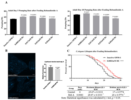 In this paper, we systematically investigated the potential physiological effects of Reb A supplementation on C. elegans. We found that Reb A treatment is beneficial towards the lifespan and healthspan of worms, and also improves their associated lipid profiles i.e., lowering neutral lipid accumulation. We showed that the average lifespan and maximum lifespan of nematodes treated with 0.0083 mM Reb A were significantly prolonged, with the maintenance of a younger physiological state. Treatment with Reb A also significantly reduces ROS level and enhances resistance to acute oxidative stress in nematodes.