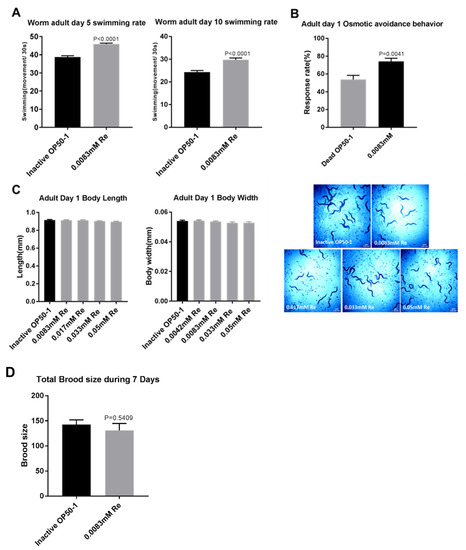 In addition to lifespan, healthspan has emerged as an increasingly important parameter for evaluation of anti-aging capacity [53]. Thus, we also detected additional physical parameters, including swimming behavior and osmotic avoidance behavior, which are effective indicators of healthspan in C. elegans. Swimming behavior was assessed via measuring the number of body swings in nematode in liquid medium. C. elegans treated with 0.0083 mM Reb A exhibited enhanced swimming behavior (Figure 2A); 0.0083 mM of Reb A supplementation elevated swimming ability in young C. elegans (5-day-old adults), and also in aged worms (10-day-old adults). Thus, Reb A significantly delayed deterioration in swimming movement caused by aging. Osmotic avoidance behavior is regulated by multidirectional induction ash sensory neurons (ASH), which mediate evasion from hypertonic solutions as well as other noxious chemicals and mechanical stimuli [37,54]. Our result showed that supplementation with 0.0083 mM Reb A significantly improved osmotic avoidance behavior (Figure 2B), which implied that Reb A enhances ASH sensitivity. However, Reb A supplementation had no significant effects on brood size, body length, and body width (Figure 2C,D). Therefore, the above results showed that Reb A supplementation increased pharyngeal pumping, swimming movement, and osmotic avoidance behavior, which indicated the maintenance of healthspan in C. elegans.
