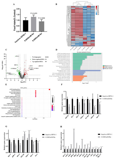 Reb A inhibited CeTOR signaling pathway. (A) Food intake showed no significant difference in worms grown under control NGM and NGM supplemented with both 0.0042 mM and 0.0083 mM Reb A; (B) Bidirectional clustering heat map of differentially expressed genes (DEGs) expression based on FPKM data of RNA-seq transcriptome; (C) Volcano plot illustrates DEGs in Reb A treatment groups relative to the control group. Red dots are upregulated genes while green dots were downregulated genes; (D) Top 20 GO terms based on transcriptome of Reb A-treated worms relative to controls. The vertical axis corresponds to the GO terms divided into different categories, and the horizontal axis displays the value of -log10 (p-value). The number on the right of each GO term indicates the number of DEGs. Green represents biological processes, red represents cellular components, and blue represents molecular functions; (E) Top altered pathways with Reb A treatment in C. elegans. The vertical axis corresponds to the KEGG pathways, and the horizontal axis displays the enriched value expressed as the ratio of DEG to the total gene number in each pathway. The size and color of dots indicates the DEG gene number and the p-value, respectively; (F) Expression level of genes in CeTOR signaling pathway, which include daf-15, ife-1, clk-2, rheb-1, let-363, mlst-8, and rps-6; (G) Gene expression levels in PI3K/Akt signaling pathway, and selected genes include age-1, pdk-1, akt-2, daf-18, aap-1, akt-1, and ist-1; (H) The expression levels of genes related to longevity signaling pathways of nematode include gcs-1, sod-3, sod-2, pha-4, lgg-1, fat-5, mtl-1, ctl-3, unc-51, daf-16, ctl-2, fat-6, and lips-17. Unpaired two-tailed test was used to examination of statistical significance, p value represented by GP type, *** p < 0.0002, ** p < 0.0021, * p < 0.0332, and others showed precise p values.