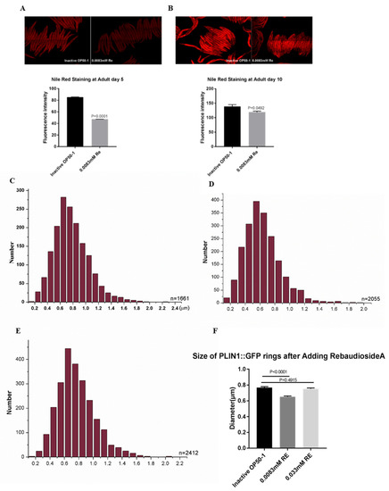 Reb A supplementation lowers lipid storage in C. elegans. (A) Nile red staining in 5-day-old adults from the 0.0083 mM Reb A and control groups; (B) Nile red staining in 10-day-old adults from the 0.0083 mM Reb A treatment and control groups. Statistical significance was calculated by unpaired two-tailed t test; (C) Distribution of lipid droplet diameters in 1st xdEx1001 strain in control group; (D) Distribution of lipid droplet diameter of 1st xdEx1001 strain in 0.0083 mM Reb A treatment group; (E) The adult lipid droplet diameter distribution of 1st xdEx1001 strain in 0.033 mM Reb A treatment group; (F) Quantification of the size of PLIN1:GFP rings in Reb A treatment groups relative to the control group. Statistical significance was calculated by ANOVA with post hoc Dunnet’s test.