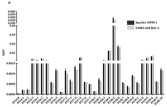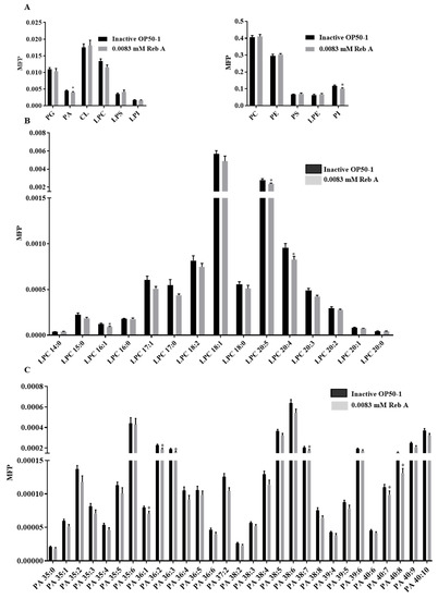 Effects of Reb A treatment on lipid storage prompted us to investigate fine changes in the lipidome of Reb A-treated worms. We quantitated phospholipid profiles of the 10-day-old adults after supplementation with Reb A. Changes in the lipid classes of phosphatidylcholines (PCs), phosphatidylethanolamines (PEs), phosphatidylserines (PSs), PIs, PAs, and phosphatidylglycerols (PGs), cardiolipins (CLs), lysophosphatidylethanolamines (LPEs), lysophosphatidylserines (LPSs), lysophospholipinositols (LPIs), and LPCs were illustrated as barplots (Figure 6A). Lipidomics revealed that PAs and PIs were significantly reduced in worms treated with 0.0083 mM Reb A relative to the control (Figure 6A), i.e., LPC-16:1, LPC-20:4, and LPC-20:5 were significantly reduced (Figure 6B), and PA-36:1, PA-36:2, PA-36:3, PA-38:7, PA-40:7, and PA-40:8 were significantly decreased (Figure 6C). As for PIs, mostly polyunsaturated PIs including PI-37:4, PI-37:5, PI-37:6, PI-37:7, PI-38:4, PI-38:6, PI-39:5, and PI-39:6 were significantly reduced in Reb A-treated worms (Figure 6D). Therefore, Reb A alters the phospholipid profiles of C. elegans. How Reb A affects membrane phospholipid composition and its possible connection with perturbed neutral lipid storage (i.e., triacylglycerols TAGs that constitute the bulk of lipid droplets) in C. elegans, however, warrants further investigation in future studies. In this light, a recent study demonstrated that enhanced de novo biosynthesis of PCs along the TAG-DAG-PC axis underlies the drastic reduction in circulating neutral lipids such as TAGs in GCK-MODY patients [62]. Reductions in PAs upon Reb A treatment may, thus, indicate a reduced supply of lipid intermediates for downstream biosynthesis of neutral lipids, while lowered PIs may indicate perturbations in the PI3K signaling pathway, respectively. High-coverage lipidomics that encompass various forms of fatty acyl derivatives may help to reveal the relevant mechanisms underlying perturbed lipid metabolism and lipid droplet morphology in Reb A-treated worms [63,64], which denotes a meaningful future direction for in-depth interrogation on the working mechanism of Reb A.