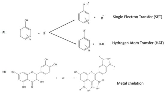 Schematic representation of an antioxidant’s mechanism of actions. Single electron transfer (SET) and hydrogen atom transfer (HAT). (A) SET involves the ionization potential of the antioxidant by transferring so as to deactivate a free radical. HAT involves the bond dissociation enthalpy in which the free radical removes one hydrogen atom from the antioxidant. (B) Metal chelation involves the binding of a metal (oxidant) to form a complex ring-like structure.