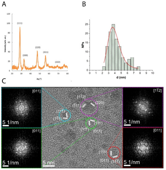 Physicochemical characterization of the synthetized CNP. (A) XRD pattern. (B) CNP diameter distribution as measured from several HRTEM images, fitted with a log-normal function (red line). (C) HRTEM images of representative CNP. Magnified regions show the single-crystalline structure of CNP, confirmed by the 2D-FFT diffractograms. For improved readability, only the main lattice planes are indicated in the insets.