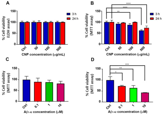 Cell viability after exposure to cerium oxide nanoparticles (CNP) and Aβ. (A,B) Human cerebral microvascular endothelial cells (hCMEC/D3) were incubated with different doses of CNP (from 50 to 500 μg/mL) for 3 and 24 h. The cytotoxicity of CNP was assessed by LDH (A) and MTT (B) assays. (C,D) hCMEC/D3 were seeded on collagen-coated 96 well plates and after 48 h of culture, cells were incubated with increasing concentrations of Aβ oligomers, ranging from 0.1 to 10 μM. After 24 h of exposure to Aβ1-42 (C) or Aβ1-40 (D), cell viability was evaluated by MTT assay. Data are expressed as percentages relative to controls (untreated cells). Bars represent the mean of 3 replicates SD. Statistical analysis was performed using one-way ANOVA: * p < 0.05; ** p < 0.01; *** p < 0.0001; **** p < 0.0001.