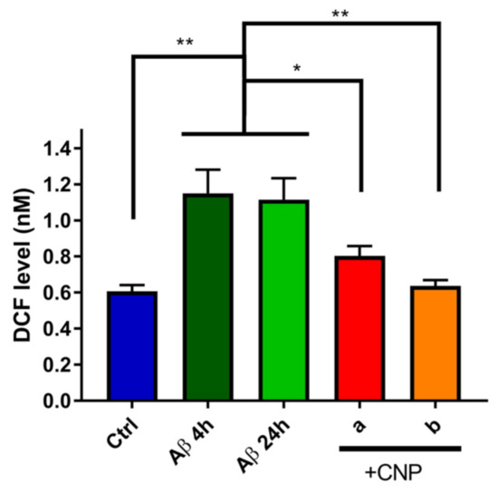 Scavenging activity of cerium oxide nanoparticles (CNP) towards Aβ-induced free radical species. The fluorescence of dichlorodihydrofluorescein (DCF), which is proportional to the level of ROS/RNS species in the samples, was measured under basal condition, after incubation with Aβ oligomers (1 μM) for 4 and 24 h and after addition of 50 μg/mL CNP (“a” = 1 h Aβ alone + 3 h in the presence of CNP; “b” = 21 h Aβ alone + 3 h in the presence of CNP). Ctrl: mean of DCF levels of untreated cells after 4 or 24 h in culture. Data are expressed as mean ± SD from three independent experiments. Statistical analysis was performed using one-way ANOVA: * p < 0.05; ** p < 0.01.