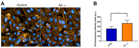To obtain high specificity and high resolution in the imaging of the internalized CNP, fluorescent microscopy and SEM have been combined [43]. Images (Figure 4A) showed that after 3 h of incubation, DiI-labeled CNP were internalized by hCMEC/D3 cells and gathered mainly in the perinuclear region of the cells as already reported for other NP [44,45]. Interestingly, an increased uptake of CNP (+43%) was detected in cells exposed to 1 μM Aβ oligomers, compared to untreated cells (Figure 4B).