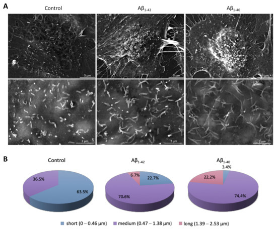 Morphological changes of endothelial microvilli after cell exposure to Aβ. (A) SEM-SE images of cell membrane protrusions formed by hCMEC/D3 cells under normal conditions or after incubation with 1 μM of Aβ1-42 or Aβ1-40 oligomers for 24 h. Magnified views of microvilli (30kx) are shown in the lower panels. (B) Classification and distribution of endothelial microvilli according to their length in the different experimental conditions. At least 10 cells and 300–400 protrusions were analyzed for each condition. Measurements were performed using ImageJ software. Control: untreated cells; Aβ1-42: cells exposed to Aβ1-42 oligomers; Aβ1-40: cells exposed to Aβ1-40 oligomers.