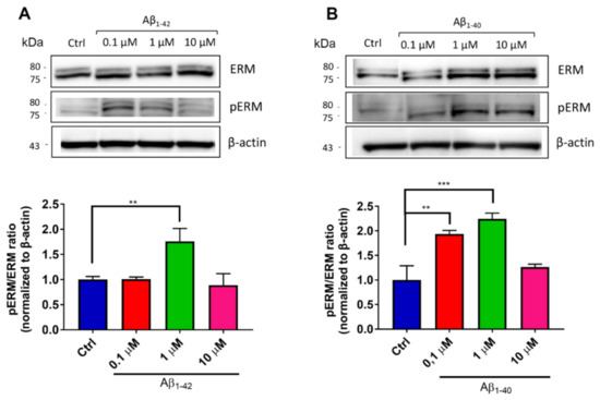 Expression of the ezrin–radixin–moesin (ERM) protein complex by hCMEC/D3 cells after exposure to Aβ. To set up an in vitro model of the blood–brain barrier (BBB), cerebral microvascular endothelial cells were seeded on transwell inserts. After 6 days of culture, different concentrations (from 0.1 to 10 μM) of Aβ1-42 (A) or Aβ1-40 (B) oligomers were incubated in the apical compartment of the transwell system for 24 h. Then, proteins were extracted and analyzed by SDS-PAGE/WB, followed by immunoblotting of ERM proteins and its phosphorylated form (pERM). The intensity of chemiluminescent bands was estimated by Amersham 600 and normalized to β-actin. Representative blots are shown. Data are expressed as mean ± SD from three independent experiments. Statistical analysis was performed using one-way ANOVA: ** p < 0.01; *** p < 0.001.