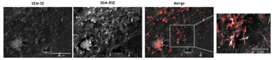 Binding of cerium oxide nanoparticles (CNP) to endothelial microvilli. SEM backscattered electrons images of CNP interaction with membrane protrusions formed by hCMEC/D3 cells after incubation with 1 μM of Aβ1-42 oligomers for 24 h. SEM secondary electrons (SEM-SE) image shows endothelial microvilli. SEM backscattered electrons (SEM-BSE) image shows CNP. The overlay of secondary electrons and backscattered electrons images (merge) and its magnified view (30kx) show the CNP (red) interaction with microvilli.