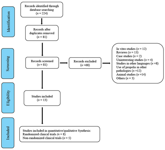 Until October 2020, 224 studies were gathered and subsequently assessed by the reviewers. The first screening led to the removal of 143 duplicates. In a second screening, 65 studies that did not clearly meet the inclusion criteria and were therefore considered inadequate were removed. After this, three more were removed for different reasons: one because it was a review/commentary [29], one that tested the efficacy of propolis in reducing chemotherapy-induced oral mucositis [30] and another [31] because it was study of equivalence conducted on induced gingivitis. This left a total of 13 studies: eight randomized clinical trials to be included in the meta-analysis [21,22,23,24,25,26,27,28] and five non-randomized studies [32,33,34,35,36] (Figure 1, flowchart).
