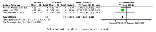 Meta-analysis was carried out to evaluate probing pocket depth at 3 months from the beginning of treatment with propolis or with a placebo, according to the tested group [21,22,23,25,26,28]. The study by Sharkawy and colleagues [26] was excluded from the meta-analysis because although it measured probing depth, it did not include numerical data. The studies by Giammarinaro and colleagues [23] and Shangani and colleagues [28] were also excluded on the grounds that they used chlorhexidine rather than a placebo with the control group to carry out the comparison and did not perform probing 3 months after the beginning of the trial. Thus, only three studies were eligible for quantitative synthesis [21,22,25].