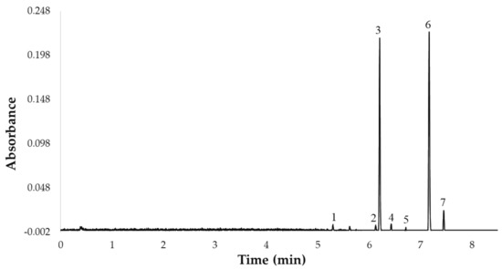 Once the 7 flavonols were identified, they were quantified by ultra-high performance liquid chromatography (ACQUITY UPLC® H-Class, Waters Corporation, Milford, MA, USA) coupled to a photodiode array (PDA) detector (ACQUITY UPLC®, Waters Corporation, Milford, MA, USA). Specifically, a rapid UHPLC-PDA method with a C18 reverse-phase column (UPLC® BEH C18, Waters Corporation, Milford, MA, USA, 50 mm × 2.1 mm i.d., 1.7 mm particle size), previously published by our team, was employed [23]. The gradient of the UHPLC-PDA method used in this study was as follows: 0.0 min, 0% B; 1.0 min, 0% B; 4.0 min, 5% B; 6.0 min, 10% B; 7.0 min, 20% B; 7.2 min, 20% B; 7.5 min, 40% B; 8.0 min, 45% B; 8.5 min 50% B; 9.0 min, 100% B; 12.0 min, 100% B; 13.0 min, 0% B. The column temperature was 47 °C, the flow rate was 0.6 mL min−1, the injection volume was 3.0 µL, and the mobile phase was a binary solvent system. Phase A was 2% acetic acid in water and phase B was 2% acetic acid in acetonitrile. The total analysis time (sample-to-sample) was 13.0 min, including the return to the initial conditions and the re-equilibration of the column, while the separation of the 7 major compounds was completed in less than 8 min. Prior to chromatographic analysis, the extracts were filtered through a 0.20 µm nylon syringe filter (Membrane Solutions, Dallas, TX, USA). The UHPLC chromatogram representing the 7 flavonols is shown in Figure 1.