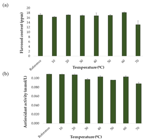 For the development and optimization of the UAE method, a response surface Box–Behnken Design (BBD) was carried out. This type of design is cha. Before the UAE method was developed to produce onion extracts from onion samples, a study was carried out to determine the stability of the compounds of interest at different extraction temperatures. This factor is essential for this study, since the temperature is generally a factor that greatly affects extraction performance. In fact, exceedingly high temperatures may lead to the degradation of phenolic compounds, while too low temperatures may not produce the necessary effect in terms of extraction performance [16,30]. For this reason, the effect of varying temperature levels on the extraction performance of a specific protocol while the rest of the conditions remained invariable was to be studied. Thus, the conditions for the temperature tests were set as follows: 50:50 MeOH:H2O extraction solvent, 60% ultrasound amplitude, 0.5 s cycle, 15 mL solvent and 20 min extraction time. The same protocol as explained in Section 2.3.2 was applied and the following temperature levels were tested: 10, 20, 30, 40, 50, 60, and 70 °C. All the analyzes were performed in triplicate. To obtain a control extract, an extraction was carried out under the same intermediate conditions but without applying an external temperature. The results obtained are shown in Figure 2a and Figure 2b. In Figure 2a it can be seen how the total content of flavonols varies as a function of the applied extraction temperature. As a result of this study, it was decided to work in a temperature range of 10 to 60 °C, since a decrease in the concentration of flavonols began to be observed in temperatures over 60 °C, probably due to the aforementioned degradation. It can be seen in Figure 2b how the antioxidant activities of the onion extracts vary as a function of the applied extraction temperature. In the case of dpph, the trend shows some ups and downs. However, it can be observed that from 10 °C the anti-oxidant capacity of the extracts is almost constant until reaching over 60 °C. Actually, a drop in the concentration of flavonols, which are responsible for the antioxidant capacity of the extracts, can be observed at 70 °C, which in turn would explain this lower antioxidant activity at temperatures over 60 °C.
