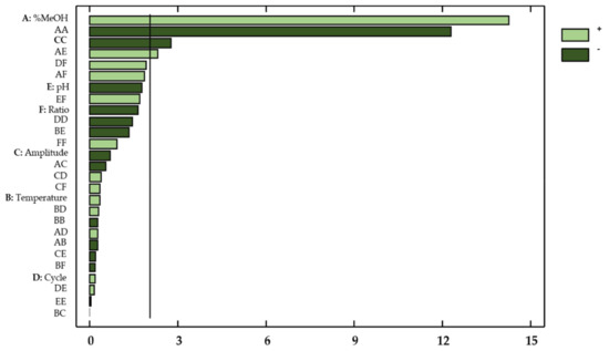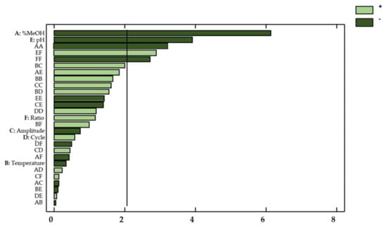 Thanks to the ANOVA and the Pareto chart (Figure 6), the factors or interactions that exhibited a remarkable influence on the antioxidant activity of the onion extracts could be determined.