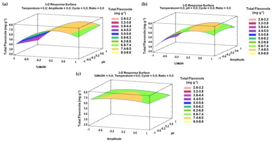 The trends that have been outlined above were recorded in three-dimensional (3D) surface plots using the fitted model to better understand the main effects and the interaction effects from the most influential parameters. The combined effects of methanol-pH, methanol–amplitude, and amplitude–pH on the total flavonol recovery are represented in Figure 4a–c.