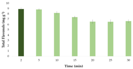 Once the optimal values of the extraction method influential factors had been established, they were used to determine the optimal extraction time of the extraction process. The antioxidant activity by the extracts obtained at different extraction times (2, 5, 10, 15, 20, 25, and 30 min) are presented in a bar graph (Figure 8) similar to the one used for the flavonoid extractions above. Each bar represented the mean value of the 3 measurements and it has also included the error bars, which are graphical representations of the variability of data, i.e., the deviation standard (SD) of the 3 measurements. All these statistical analyses have been carried out with the software Microsoft Office Professional Plus 2016.