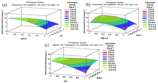 Similarly to the phenolic compounds, for a better understanding of the main effects and the interaction effects from the most influential parameters, the trends that have been outlined above can be represented by three-dimensional (3D) surface plots based on the fitted model. The combined effects of the methanol–pH, methanol–ratio, and pH–ratio on the antioxidant activity of the onion extracts are represented in Figure 7a–c.