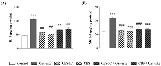 As expected, Oxy-mix induced a strong increase in the proinflammatory cytokines released by CaCo-2 cells in the culture medium (2.25- and 3.3-fold increase of IL-8 and MCP-1, respectively) (Figure 1).